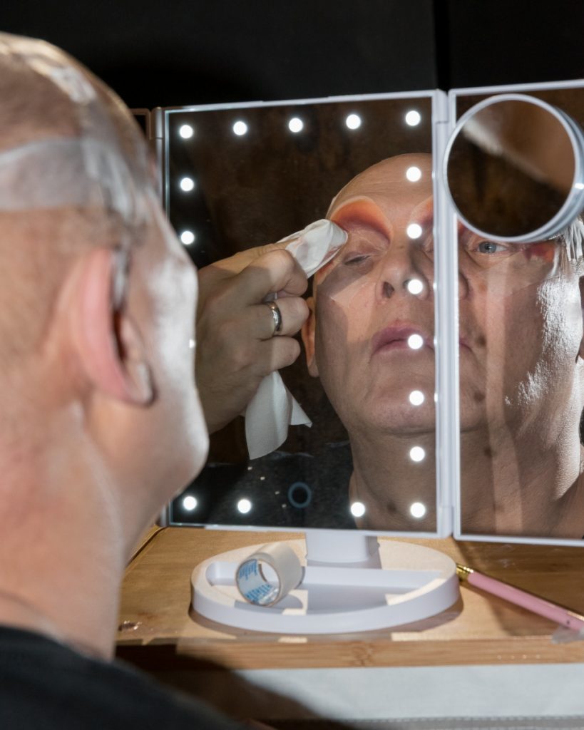 It stops everyone in their tracks, everyone sings along, and Cheri feels the love. In a blink of an eye, it’s time for Cheri to become Mark once more. This time it’s not behind closed doors, it’s where she is most vulnerable in front of her audience. She opens up the suitcase at the side of her grabs a towel and wipes her makeup from her face, takes off her costume and becomes Mark once more. The audience applauds as he leaves.